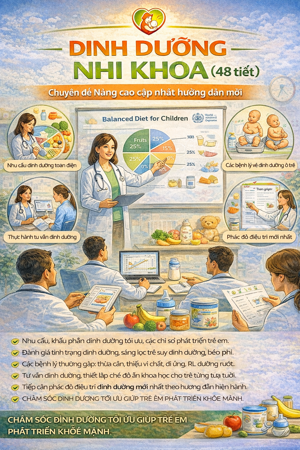 Dinh dưỡng đóng vai trò then chốt trong sự phát triển thể chất và trí tuệ của trẻ em, đồng thời ảnh hưởng trực tiếp đến sức khỏe lâu dài. Tuy nhiên, các vấn đề như suy dinh dưỡng, thiếu vi chất, béo phì và rối loạn hấp thu ở trẻ vẫn còn phổ biến, đòi hỏi cán bộ y tế cần được trang bị kiến thức chuyên sâu và cập nhật.