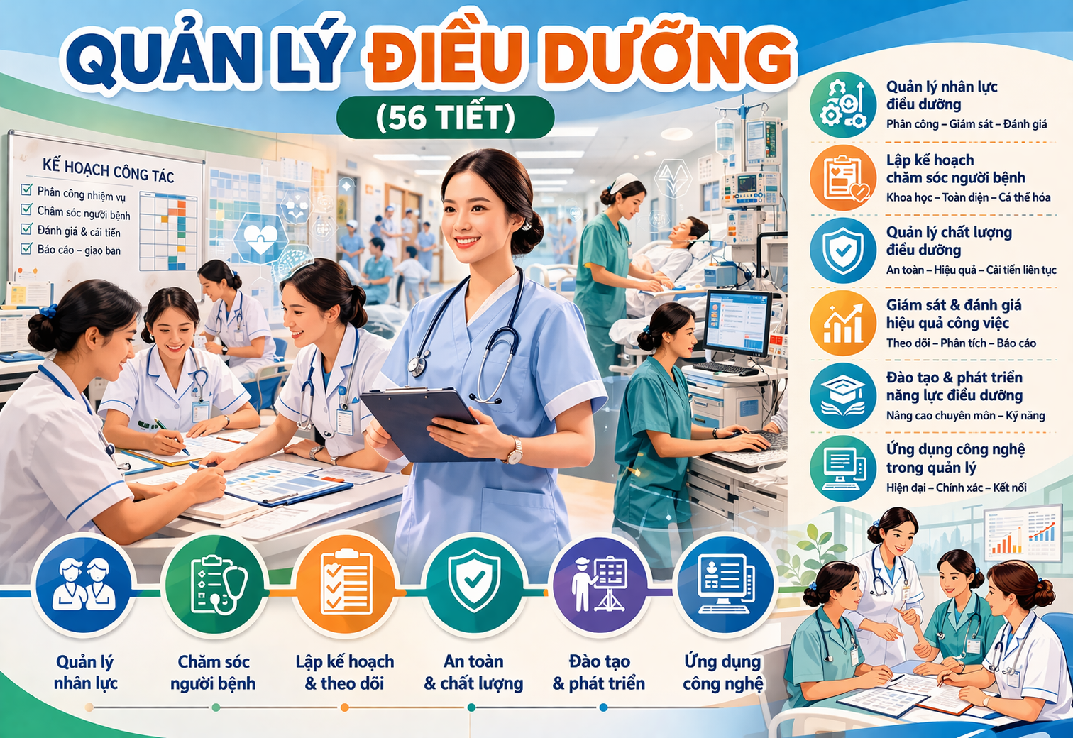 Chương trình tập trung vào các năng lực cốt lõi như lãnh đạo điều dưỡng, quản lý nhân lực, quản lý chất lượng, an toàn người bệnh và đào tạo liên tục. Đồng thời, học viên được trang bị kỹ năng lập kế hoạch, giám sát, đánh giá và triển khai thực hành chăm sóc dựa trên bằng chứng.