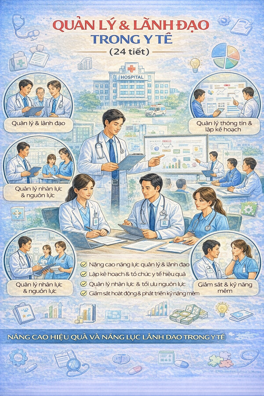 Khóa học “Quản lý và lãnh đạo trong y tế” được xây dựng nhằm cung cấp kiến thức nền tảng và kỹ năng thực hành trong quản lý, từ lập kế hoạch, quản lý nhân lực, thông tin y tế đến giám sát và đánh giá hoạt động.