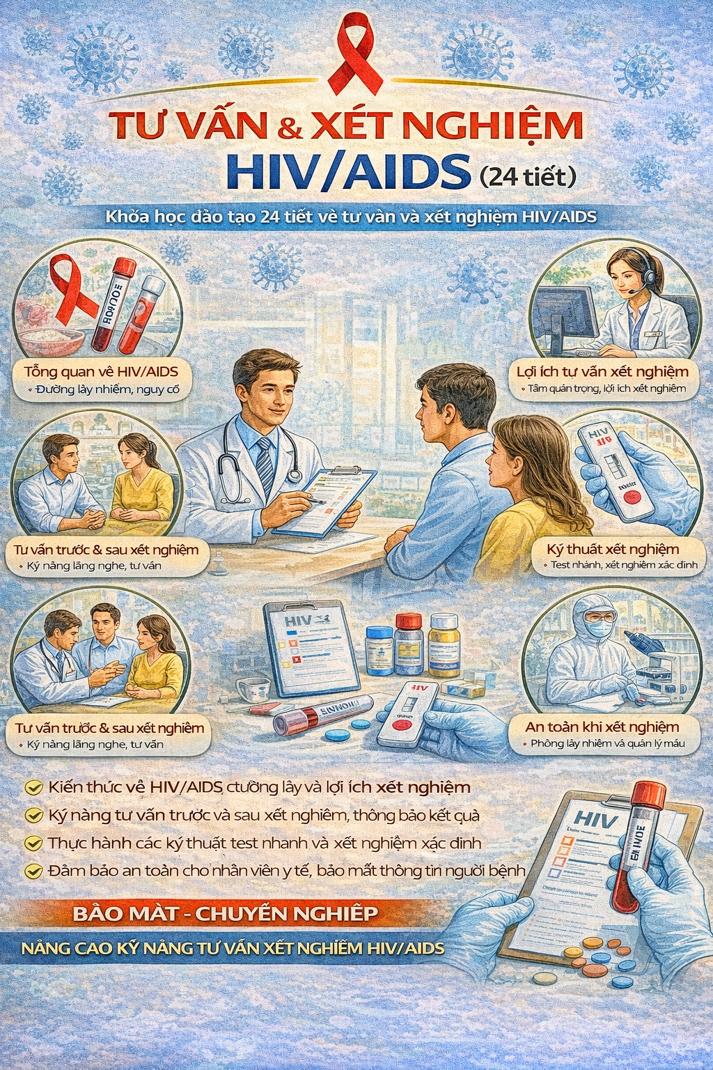 Trong bối cảnh HIV/AIDS vẫn là vấn đề y tế cộng đồng quan trọng, việc phát hiện sớm và tư vấn đúng cách đóng vai trò then chốt trong kiểm soát lây nhiễm và nâng cao chất lượng cuộc sống cho người bệnh. Nhân viên y tế không chỉ cần nắm vững kiến thức chuyên môn mà còn phải có kỹ năng tư vấn, giao tiếp và hỗ trợ tâm lý hiệu quả.